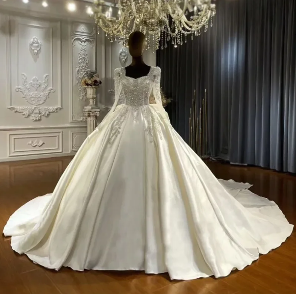 Modern Arabic bridal fashion has embraced dramatic ball gowns. These dresses feature voluminous skirts, structured bodices, long trains, and luxurious embellishments. They create a royal and majestic look, perfect for grand wedding halls.