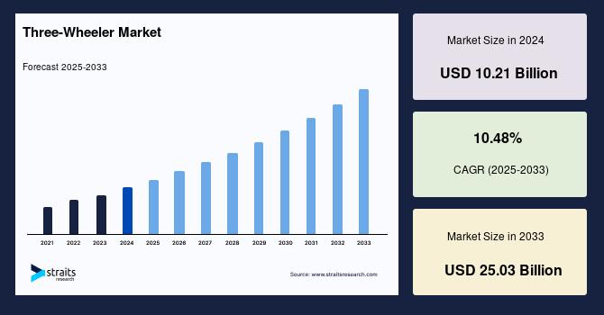 According to StraitsResearch, the global three wheeler market size is valued at USD 10.21 billion in 2024 and is estimated to reach USD 25.03 billion by 2033, growing at a CAGR of 10.48% during 2025-2033.
